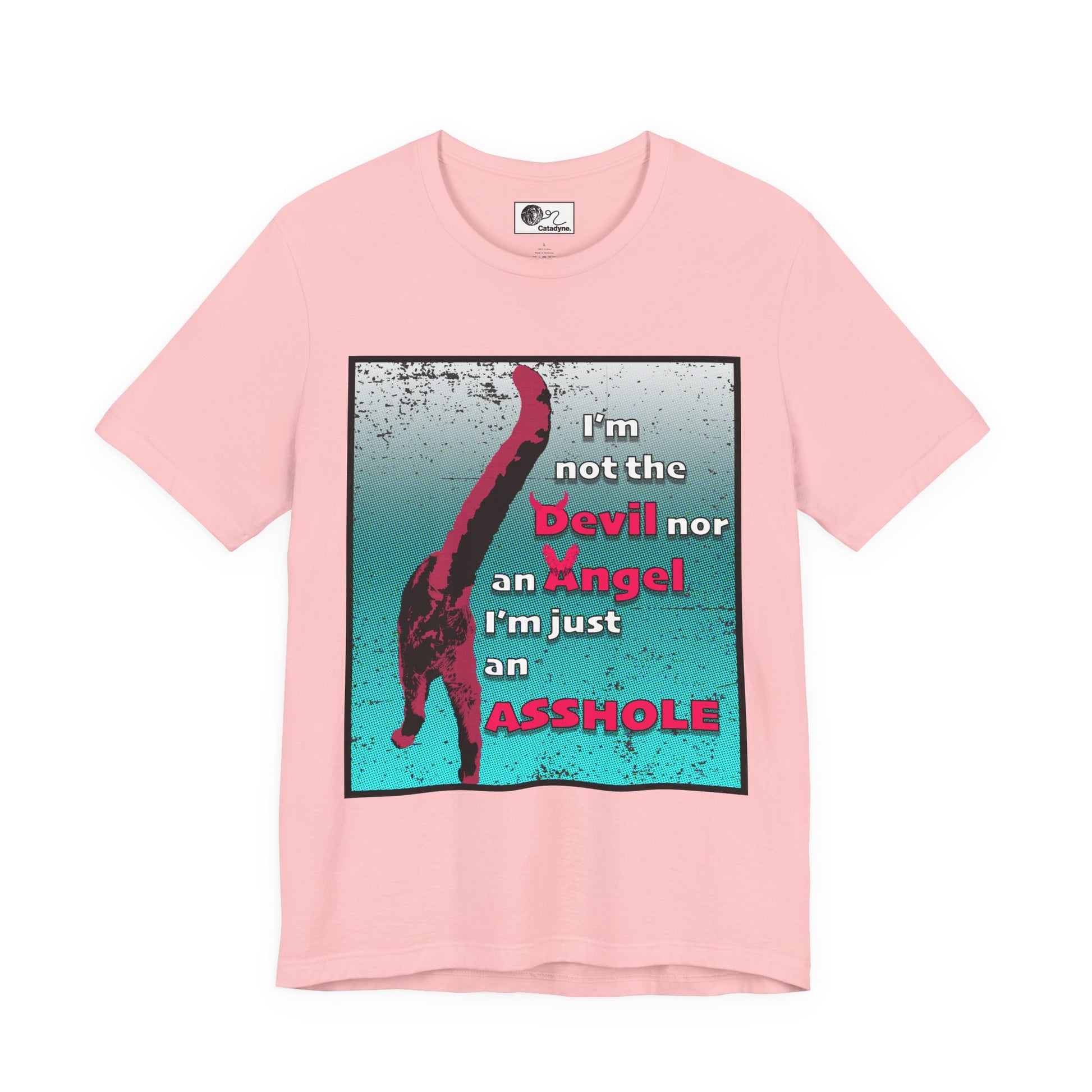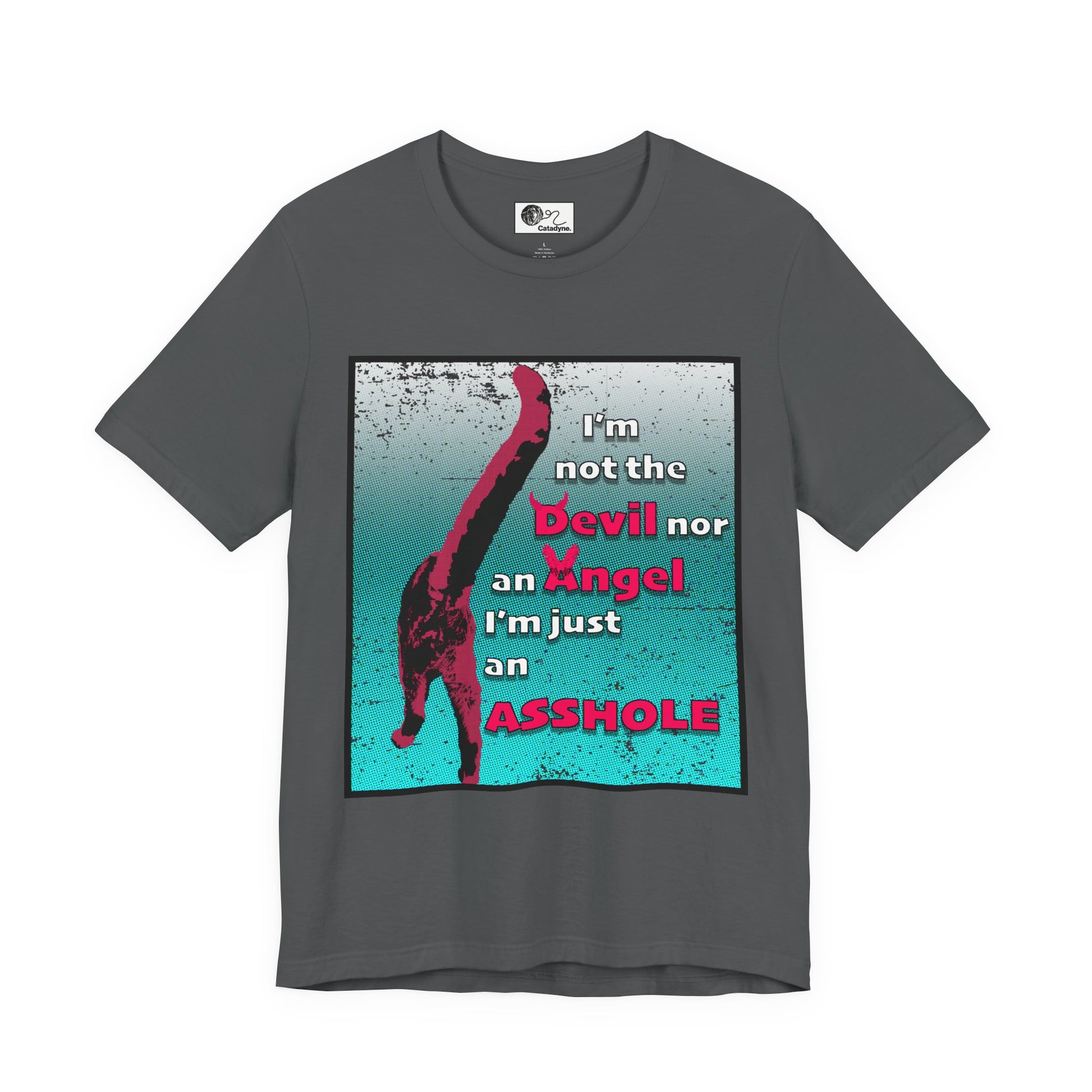 The Fallen Angel collection T-Shirt featuring an edgy design of an angel or devil with the text 'nope I'm just an asshole'. Perfect for those who appreciate unique, unconventional fashion. Great for casual wear and edgy street style. Ideal for individuals who enjoy making a statement with their clothing. Relevant for Halloween, Gothic fashion enthusiasts, and those who embrace their rebellious side.